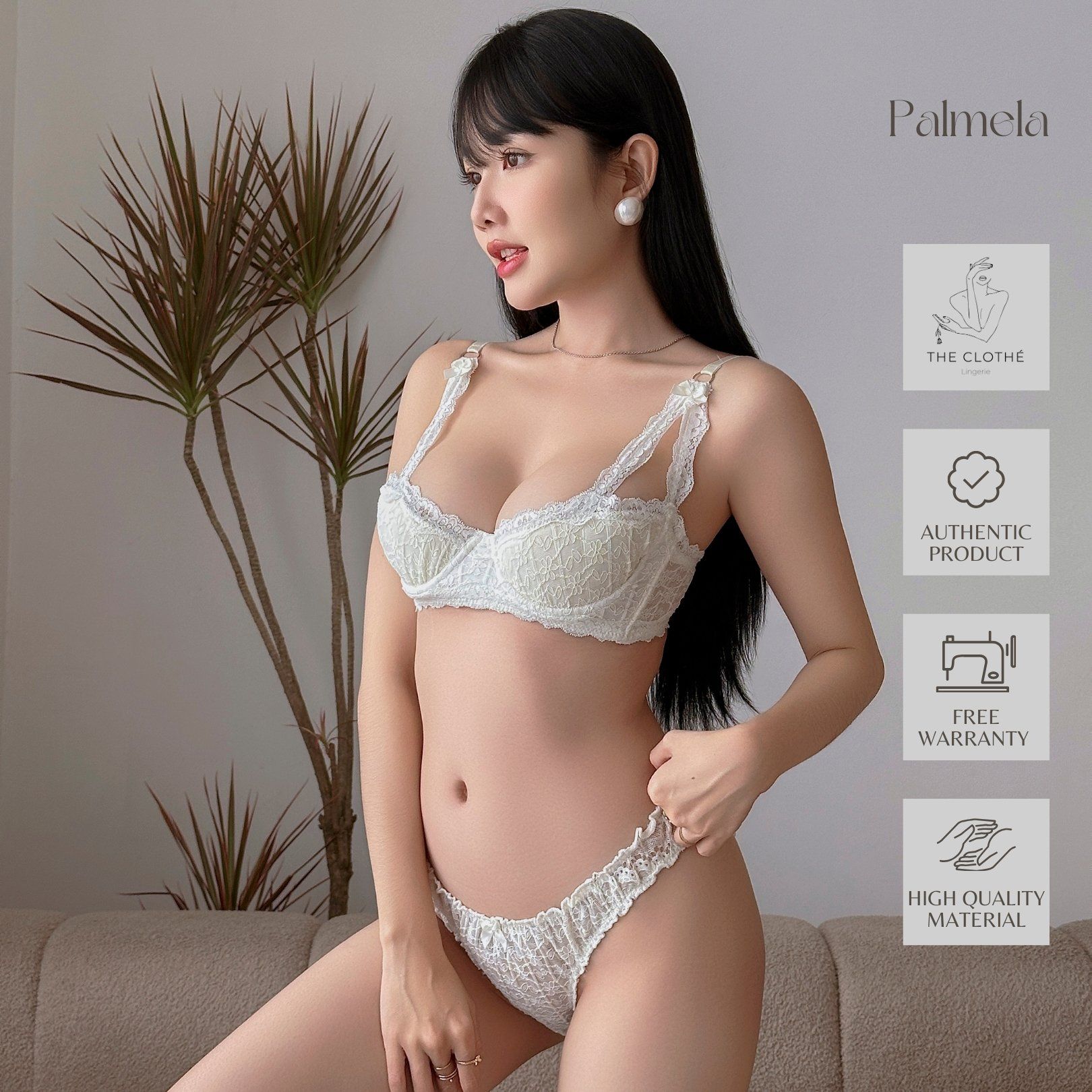 Lace Palmela tông màu trắng được mẫu diện cực xinh, ren limited chỉ có 15 set dành cho nàng sở hữu sớm. Sản phẩm có gọng, mút mỏng, cúp 1/2 mang đến vẻ quyến rũ, khóa sau 3 cỡ linh đông. Panty của Palmela được thiết kế theo dáng tanga nhún theo phong cách trẻ trung, năng động.